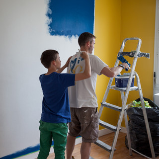 Puis est venu le moment de peindre les murs. Cela n'a pas été évident car Paul voulait du rouge et non vraiment, le rouge je ne peux pas ! Ce n'est beau que sur les lèvres... Alors on a tergiversé pour trouver des couleurs vives mais pas criardes, gaies mais pas "bienvenue au cirque". Alors on a opté pour jaune, bleu, gris.